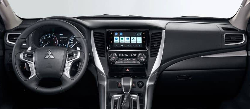 O painel tem linhas que se assemelham aos da picape L200 Triton Sport, sendo em realidade o mesmo conjunto de multimídia e ar-condicionado dual zone.